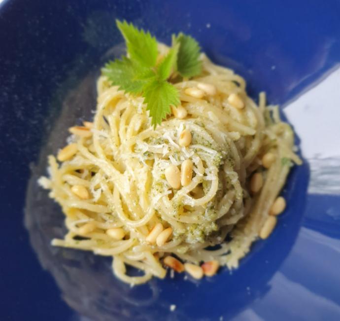 Rör ner peston med spagettin och toppa med riven Gruyere, rostade pinjenötter och lite salt.