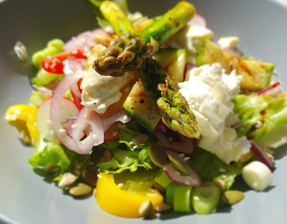 Salladsblad, rödlök, vårlök, körsbärstomater, gul paprika och gurka