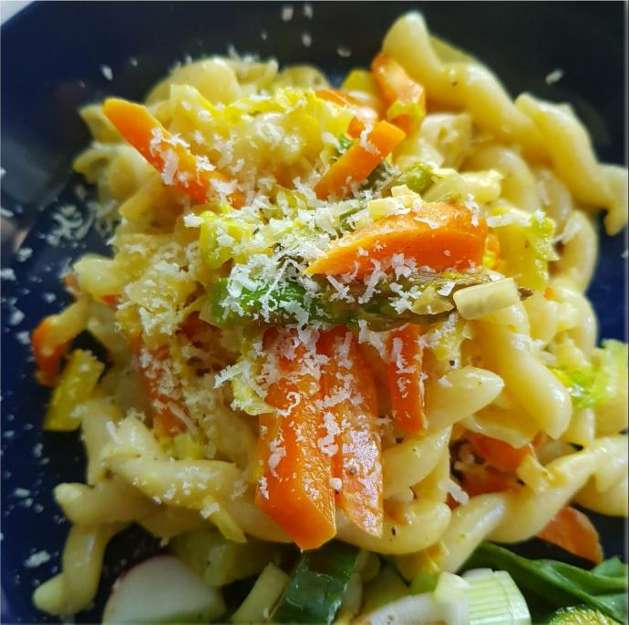 Morötter, vitkål, lök, vitlök, chili, sparris och gulpaprika. Skär i bitar och fräs upp allt, krydda med salt, svartpeppar och curry. När grönsaker börja kännas mjuka tillsätt grädde och låt koka ihop. Vi hade kokt pasta i kylskåpet så de hamna i stekpannan med såsen, så pastan fick gotta till sig och bli varma. Lägg upp tallrik och riv över en väl lagrad ost, om de finns i kylskåpet. Vi hade en kant Trentingrana D.O.P minst 22 månadrer lagrad, som vi rev över maten.